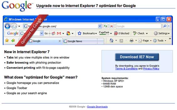At 5:06 pm this evening we wrote that Google had apparently stolen the content and the look of a Yahoo page promoting IE7, even showing the Yahoo toolbar with the Yahoo logo blurred out. Six hours later, Google has replaced the site in question with an entirely new one. This one thankfully shows the Google Toolbar prominently installed.