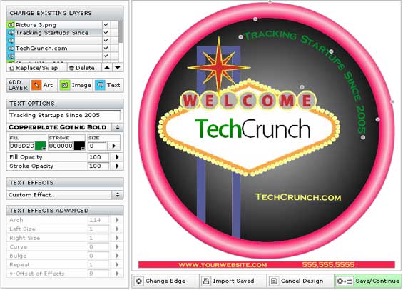 There are many sites that sell customized casino chips (just do a search), but we haven’t found any that have an online design tool to allow you to create the chip itself. TheChipLab has take the extra step and has created a very nice Flash tool for designing your own casino-grade chip. The creation tool is very flexible and layer based. It’s not as powerful as new online image editor Fauxto, which is also Flash based, but it does the job.