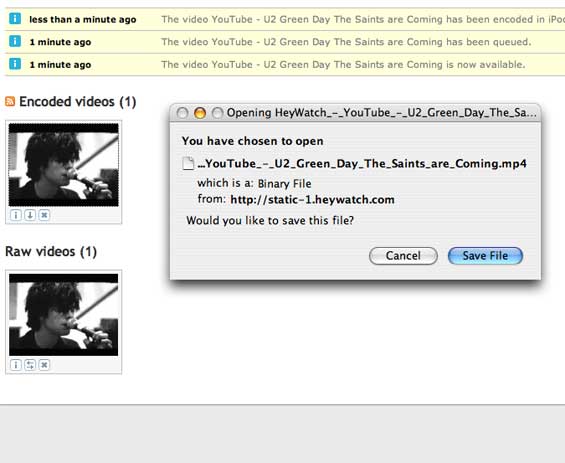 Once files are uploaded, they can be converted to all of the usual formats and then downloaded. And they’ve also used RSS intelligently here as well – they’ve created a RSS feed for all of a user’s converted files, so they can simply be gathered from a feed reader without going back to the Hey!Watch site each time.