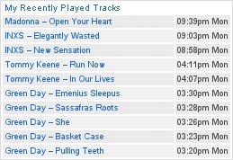 Oh and did I mention profiles? Yes you can add friends and find friends with similar tastes in music. They also allow you to check out new music with the Last.fm player – a piece of software that plays songs like a radio based on your musical tastes. You can even have RSS feeds of your last-played tracks. I highly recommend checking it out if you’re into music at all. You can view the last 10 songs I’ve listened to below.