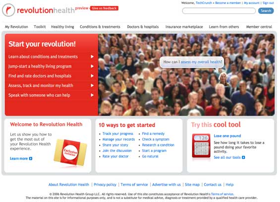 AOL Co-founder Steve Case, who left Time Warner (AOL’s parent company) in 2005, has effectively launched his next startup – Revolution Health. The domain name still shows a landing page, but the preview site is wide open to all comers.