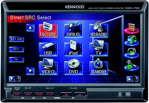 To ensure this connection Kenwood is introducing a system built around an external media controller, which is a full-featured audio/video component with multiple connectivity choices. Both the KOS-V1000 and KOS-V500 can be used without replacing the head unit, or modifying the dashboard. The system allows Kenwood dealers to integrate multiple products, and can be used with factory-installed video monitors and even combined with an optional touch-screen monitor, the KOS-L702, a 6.95-inch widescreen on-dash monitor with built-in speaker. The touch-screen allows the user to control the various components via custom Kenwood GUI.