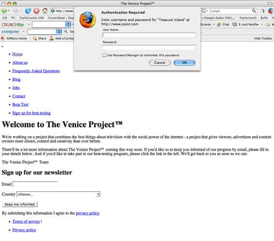 A tip from reader Joost Schreve led us to the domain name Joost.com: if you click the “cancel” button multiple times an unformatted web page pops up with information about the Venice Project. We have subsequently confirmed that this is the actual launch name of the company.