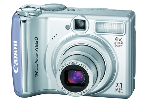 Cannon today announced two new entry-level cameras that will be available in mid-February: The PowerShot A550 (bottom) and PowerShot A460 (top). Both cameras are pretty cheap at $199 and $149 (respectively), but they both use AA batteries instead of nice rechargeable Li-On batteries. The A550 is a 7.1-megapixel camera that uses SD, MMC, or SDHC cards, uses Canon’s DIGIC II image processing, can shoot 30fps movies, 4x optical zoom, a 2-inch LCD, and power saving options.