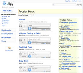 Think Digg for music, plus lots of Flash functionality. Songs are presented on the home page and can be “jigged” by members. Songs can also be embedded into web pages (I’ve done so with one of the popular songs below), commented on, etc. Songs are tagged for easy browsing, and there are most popular and recently posted areas as well.