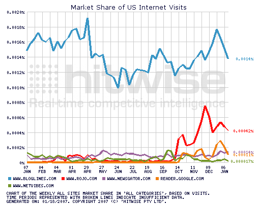 Hitwise says different. In a post tonight comparing the web based readers, they put Bloglines and Rojo firmly ahead of Google Reader. Generally Hitwise seems to be on the money, but something doesn’t add up.