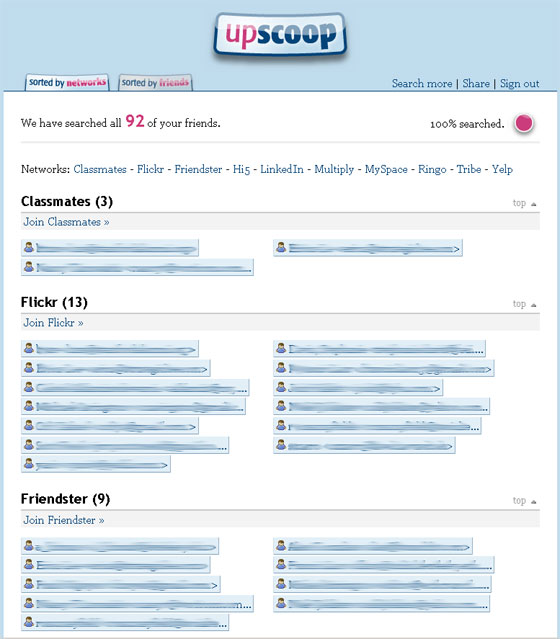 Upscoop is designed to help you figure out which networks your friends belong to, based on their email address. You give Upscoop your email credentials (including the password) for your AOL, Gmail, Hotmail, or Yahoo email account. Upscoop grabs your contact list, and then searches across a number of social networks and tries to find profile pages of people that you know among the 10 million profiles they’ve indexed across the major social networks. The process of searching is not instantaneous – it actually takes a few hours.