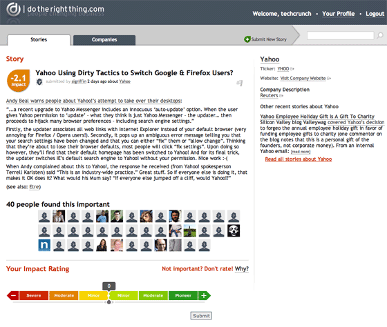 I took a look at new startup DoTheRightThing this evening. This is a Digg-like site where people submit stories about companies acting in ways that can be considered “good” or “bad.” Other users then vote on the goodness or badness of those actions, add comments, etc. An overall “goodness” score, ranging from “severe” on the negative end to “pioneer” on the positive end is calculated and displayed.