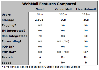 The following chart compares the services on a feature-by-feature basis. Note that the user numbers for Yahoo and Hotmail include legacy users still on the old platforms.