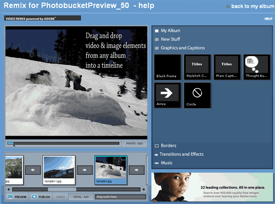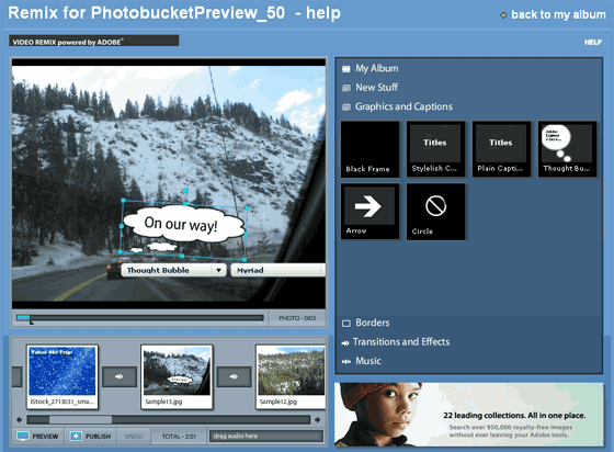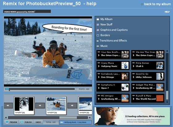 Users are restricted from uploading their own audio files (copyright concerns drove this), but Photobucket says they may add a record button to allow a narrative of the photo/video stream in the future. For now, a selection of licensed stock music is available. Users can also add transition effects, text bubbles, frames and other effects to the mashup.