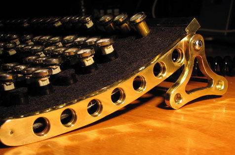 Here’s a great keyboard mod involving glass and nickel keys on a polished brass frame. The build images are incredible and when he ran out of keys — old typewriters didn’t have a “help” key — he simply bought a few brass trimmed buttons and made his own.