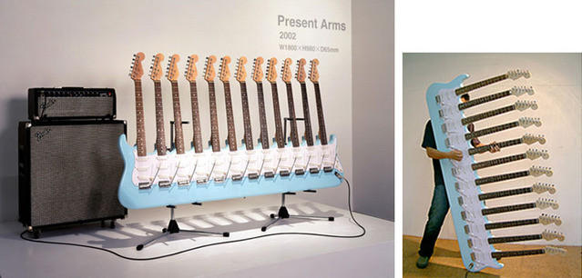 The picture you see is part of Yoshihiko Satoh’s exhibit called THE ARMS. Based around the theme of music and guitars, one piece is basically 12 Fender Strats welded together. The kicker? You can actually play this 12-neck behemoth. Imagine if you had a virtuoso for each neck — Allan Holdsworth on one, Eddie Van Halen on another, maybe John Petrucci too. There’s also a beautiful “pinwheel” made up of 12 blue guitars that also resembles a clock.