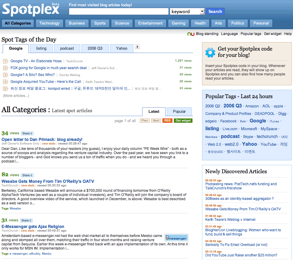 Can Spotplex become as popular as Digg, or more so? I think it can if it evolves properly. Unlike Digg, Spotplex won’t have to deal with voting fraud. Spotplex will have their own unique fraud issues to manage, though. Another problem with Spotplex is the fact that large blogs and publications will dominate it to start just because they have large readerships already. To avoid this “the rich become richer” problem, I’ve suggested to Spotplex that the rankings be based on a publication competing with itself – so only very popular stories on TechCrunch (compared to average TechCrunch traffic) would get to the Spotplex home page. The Spotplex team has said that they’ll be tweaking their algorithm constantly after launch based on real data they get from the beta.