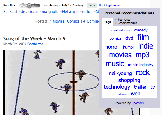 Spotback is centralizing user feedback as well. The first time a user rates or tags a story, that data is stored on a dedicated profile page for them back at Spotback. That page will also recommend content to them from other sites based on those ratings.