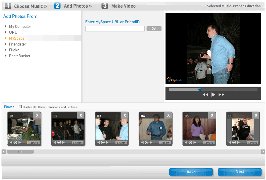 Their new web editor makes creating the slide shows significantly easier by automating most of the work. To make a FlipTrack now, all you need to do is pick any one of their 350 songs and upload a group of photos from your computer, URL, MySpace, Friendster, Flickr, or PhotoBucket. The editor then automatically syncs the photos up to key transitions in the song, known as a song map (see the sync to “Eye of the Tiger” below). The system is pretty smart about how to space the time delays between photos and won’t take up an entire song if there are too few photos.
