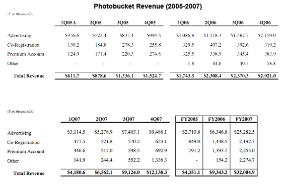 Included in the documents distributed to buyers is a revenue breakdown of the company by year. In 2005, Photobucket revenue was $4.35 million, growing to $9.34 million in 2006 and on pace to hit over $32 million this year. Last year, advertising accounted for 68% of revenue. This year, they estimate it will grow to 79%. See full revenue breakdown in the image below.