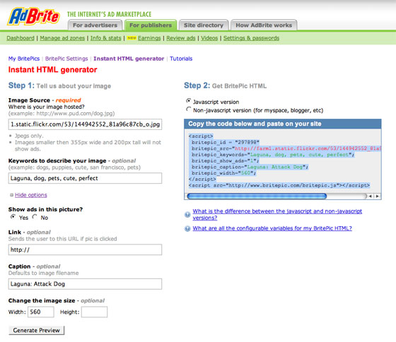 Advertising network AdBrite, which is always looking for new ways to think about things, says it can. This morning, AdBrite launches BritePic to help people add a lot of new functionality around embedded images. Just by changing the embed code, web publishers can add a caption, watermark, zoom, share, resize and other features. And an advertisement, if they choose to.
