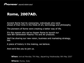 Pioneer is all over plasma TV, and it looks like it’s going to launch its 8th-gen plasmas at an event in Rome this May. Pioneer kept going on and on at CES about how it wanted to make plasma the premier TV technology and this announcement should finally reveal what it’s been up to.