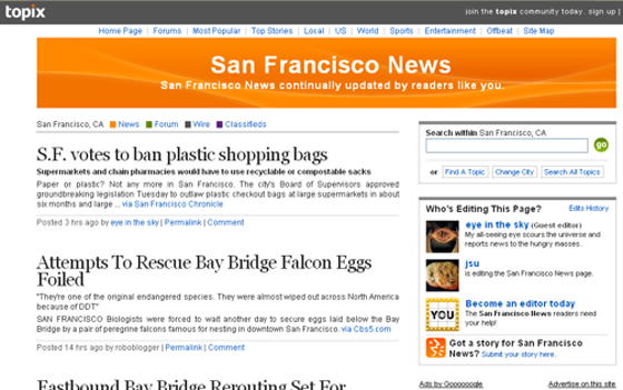Topix already has local news pages for cities and towns across the United States and Canada (here’s the page for Atherton, CA). The news is auto-generated for those pages currently. Tonight, Topix will let users of the site become local editors, and write or expand on articles that will be of interest to that community.