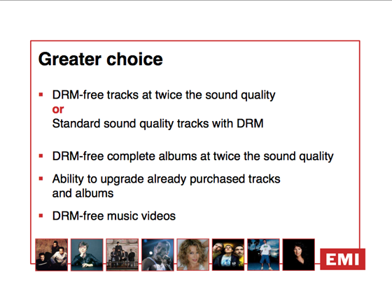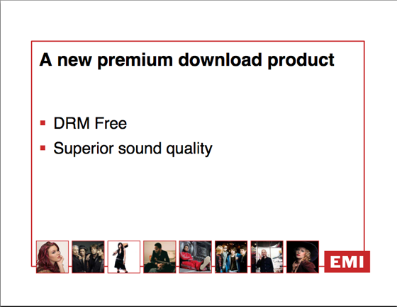 EMI will offer all songs from its digital catalog without DRM. Testing earlier this year suggested people prefer non-DRM to DRM tracks 10:1. iTunes is first partner.