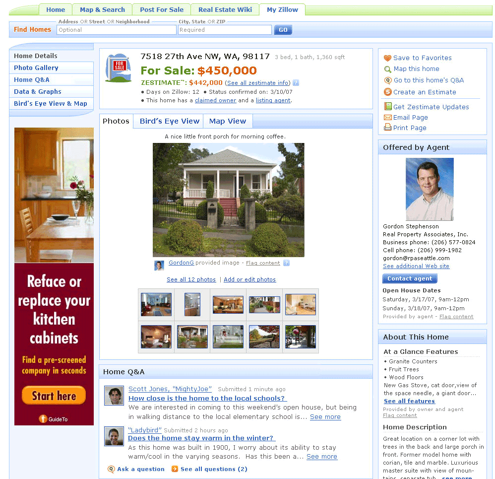 Every home in the Zillow database has its own dedicated page. Any user can now also add photos and information about any home and its neighborhood to the site. Users can also indicate if a home is for sale, and the asking price, as well as additional information. This is an expansion on user-generated content features added last September. Previously only the 600,000 registered users who claimed their homes or over 150,000 real estate agents could list a home for sale or post photos of the home. Now any registered user can list a home for sale and post an unlimited number of photos for the home, although the prime real estate on the listing is still reserved for a certified owner or agent. Bad photos and information can be flagged by other users.