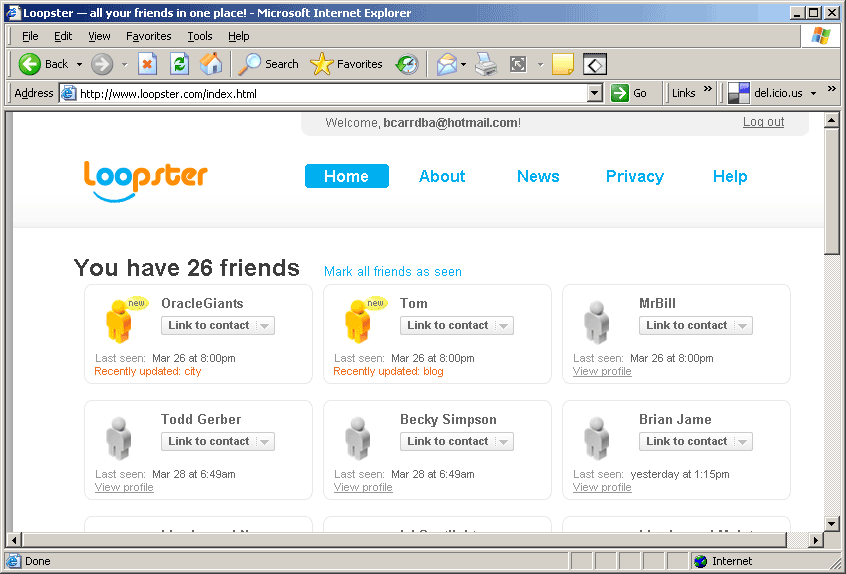 You interact with your friend’s profiles through a main page with a grid of all of your friends from each network. Whenever a friend’s profile is updated, their profile lights up with a “new” icon and a note about what has changed. You can either click through to Loopster’s summarized version of the profile or click directly through to the original source. Since you probably have some overlap between the friends in each of these networks, Loopster also lets you merge together profiles of the same person from different networks. However, the program is still a little buggy and I wound up with multiple copies of the same profile. This was probably due to some impatient clicking of the “add friends” button, which sent multiple crawlers to the same site, grabbing the same info.