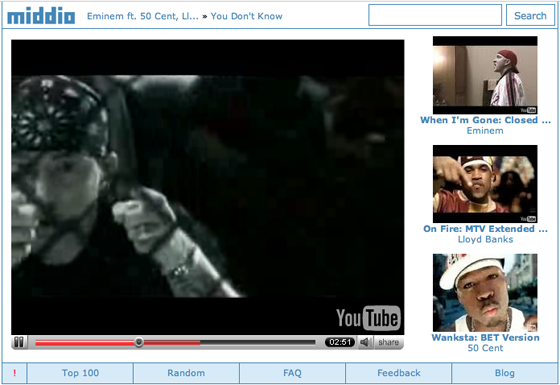Middio is a new site, still in private beta, that’s indexing music videos from YouTube and tagging them properly with the artist and song name. The search interface is good; finding a music video for a given artist takes just a moment and there’s none of the non-relevant content you see with YouTube searches. Videos are also embedded in the Middio site.