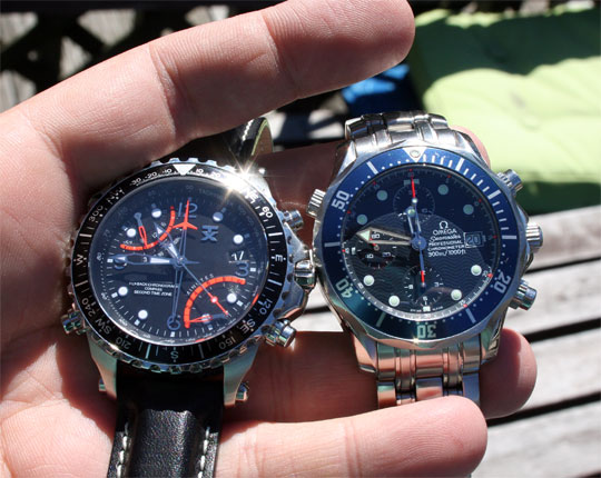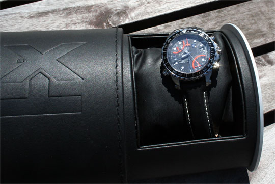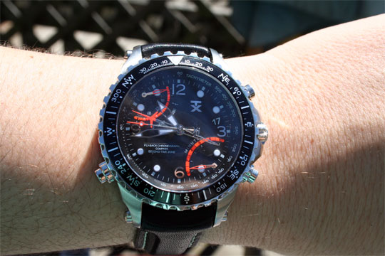 Aesthetically, this 46mm watch is quite striking. It has luminous, skeletonized hands and hour pips along with an enameled crown. There is a compass bezel and inner markings for the tachometer. Generally, there is very little to show that this is made by the same folks who sell $5 at the local drug store.