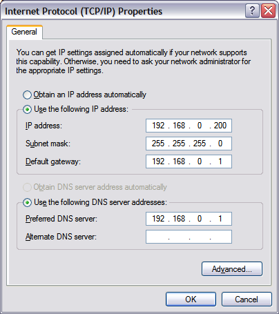 5. Set your IP address manually: (ip address generally can be whatever you want it to be within certain limits, the subnet mask, default gateway, and DNS settings should correspond to your particular router. Check your router manual for more information)