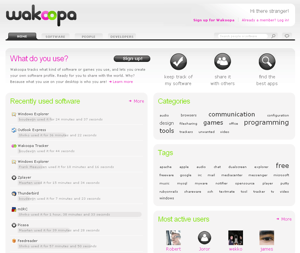 Last.fm does for music what Dutch startup Wakoopa wants to do for your desktop applications. Like Last.fm, Wakoopa uses a downloaded tracker, except it follows how often you use applications instead of listen to music. Similarly, Wakoopa has also built a Rails-powered social website around the data, letting users share their preferences with friends, write reviews of their favorite application, and download new ones. Wakoopa is backed by a fund of the three biggest media companies in the Netherlands (Ilse, IDG, Telegraaf) and launches May 2nd.