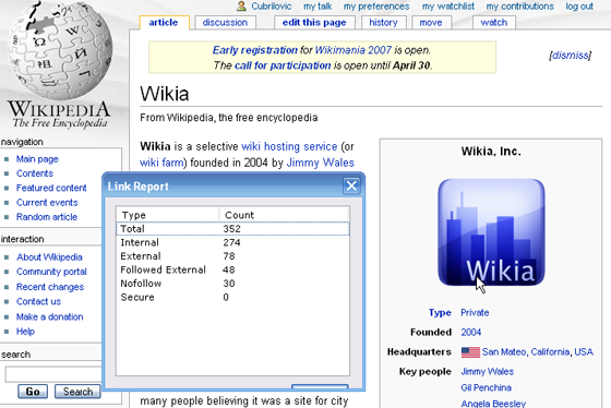 In Febuary of 2005 the Wikipedia community voted in favor (by a vote of 61% to 39%) of removing the nofollow tags, but this outcome was overruled by Jimbo Wales, the founder of Wikipedia, earlier this year. It seems that while the nofollow tag is added to the standard outbound links, it isn’t applied to inter-wiki links, including links to Wikia, Wikipedia’s for-profit spin off. For example, on the Wikipedia page for Wikia there are a number of links to Wikia pages which do not contain the nofollow tag:
