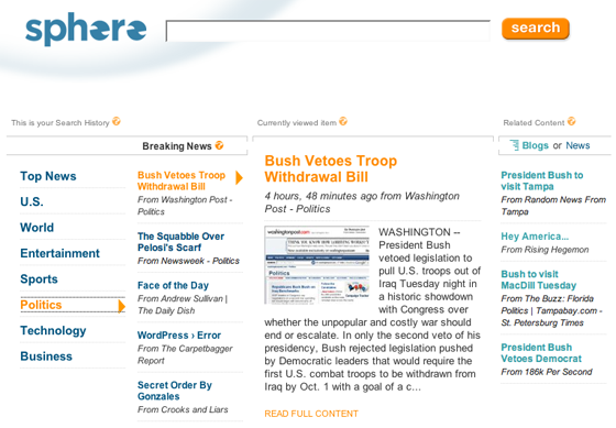 Like TechMeme, the new Sphere site can become a place that people check frequently to see what news is breaking in the blogosphere and mainstream media, and see other content about that topic. It’s different than TechMeme in that Sphere doesn’t require links between articles.