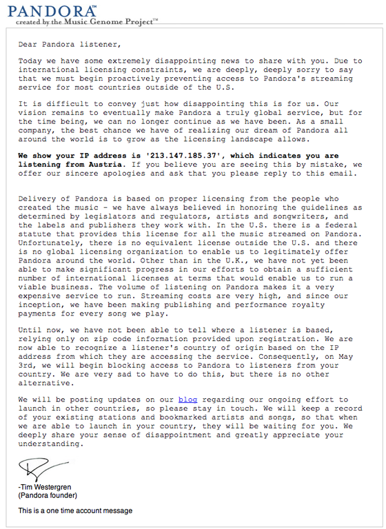 If you live outside of the U.S. and enjoy listening to customized radio stations on Pandora, brace yourself for some bad news. The site will be shutting you out starting Thursday evening. Registered users who access the service from outside the U.S. received a warning email yesterday letting them know that this will be happening.
