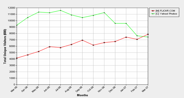 The first graph below shows only U.S. traffic for Flickr and Yahoo. The table below that shows March Comscore numbers for the worldwide audience.