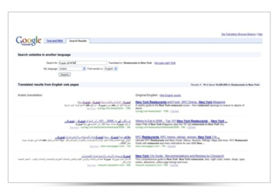 The screen shot is extremely poor quality (I apologize), but it shows arabic results on the left, translated from English results on the right.