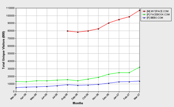 We’ve pulled worldwide Comscore stats for MySpace, Facebook and Bebo. The most recent data (March) shows MySpace with 107 million unique monthly visitors. Facebook had 32 million and Bebo had 13.7 million. Bebo users tend to spend a lot of time on the site – on average they view just over 20 pages per day each, about equal to Facebook and a bit more than MySpace..
