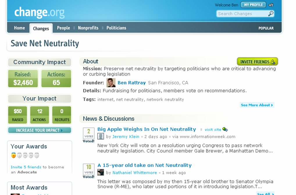 Tonight, Change.org is launching an ambitious version 2.0 that expands beyond nonprofits and into political fundraising and lobbying. Founder Ben Rattray says politicians are expected to raise over $3 billion in this election cycle, with about half of that spent on fund raising (running total here). He says nonprofits receive donations upwards of $250 billion a year, with $50 billion of that money spent on chasing down a donors. Change.org wants to lower those fund raising costs, counteract large donor’s “special interest” money, and help give a voice to the average Joe who can’t afford a $2,500 a plate dinner.