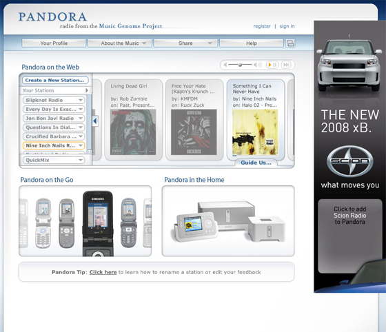 Pandora has also redesigned its website to better integrate the listening and community features. The company says they now have 6.9 million registered listeners who have played 4.7 billion songs and voted up or down half a billion times. This makes them, they say, the third largest Internet radio station in the world. They play 94% of their entire catalog every day, so they are dipping far into the long tail of music.