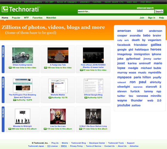 The most noticeable visual change is to the home page, which has been completely redesigned (see image above). Technorati has also eliminated search types (keyword search, tag search and blog directory search) in favor of a single search box. All search results are returned in the format technorati.com/tag/query (example) and show results from blogs, videos, photos and audio files all on the first result page. Users can drill down into vertical results via tabs. Users who want only blog search results can now go to search.technorati.com.