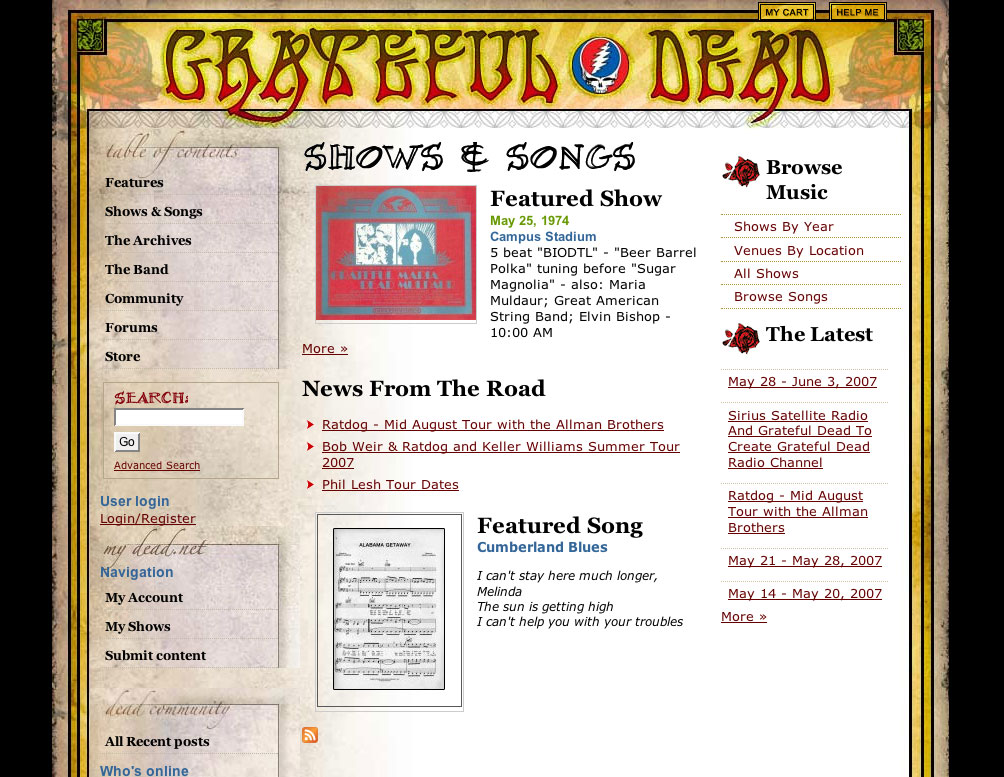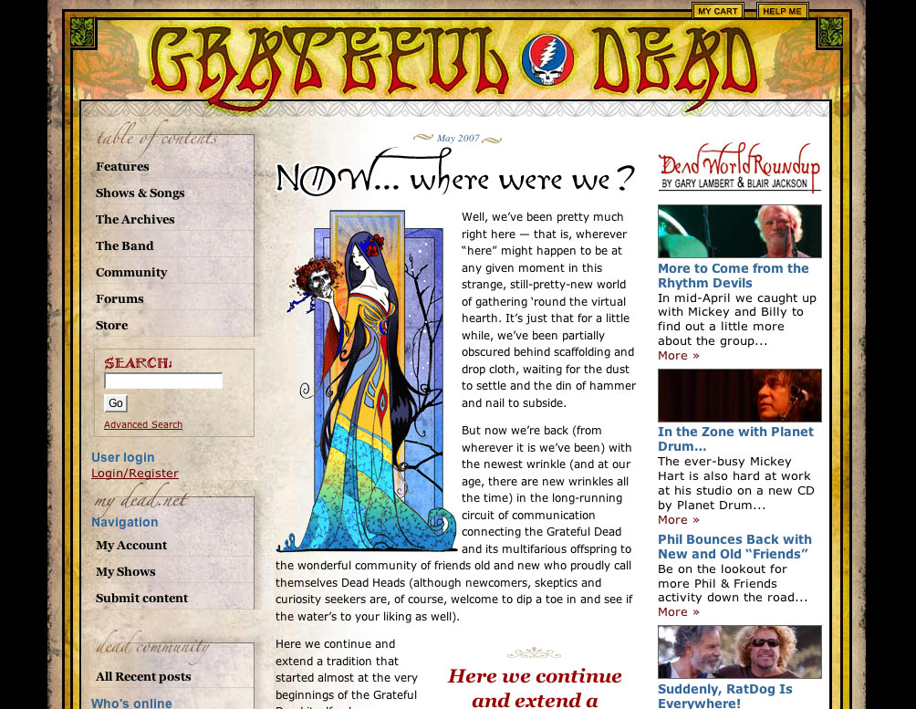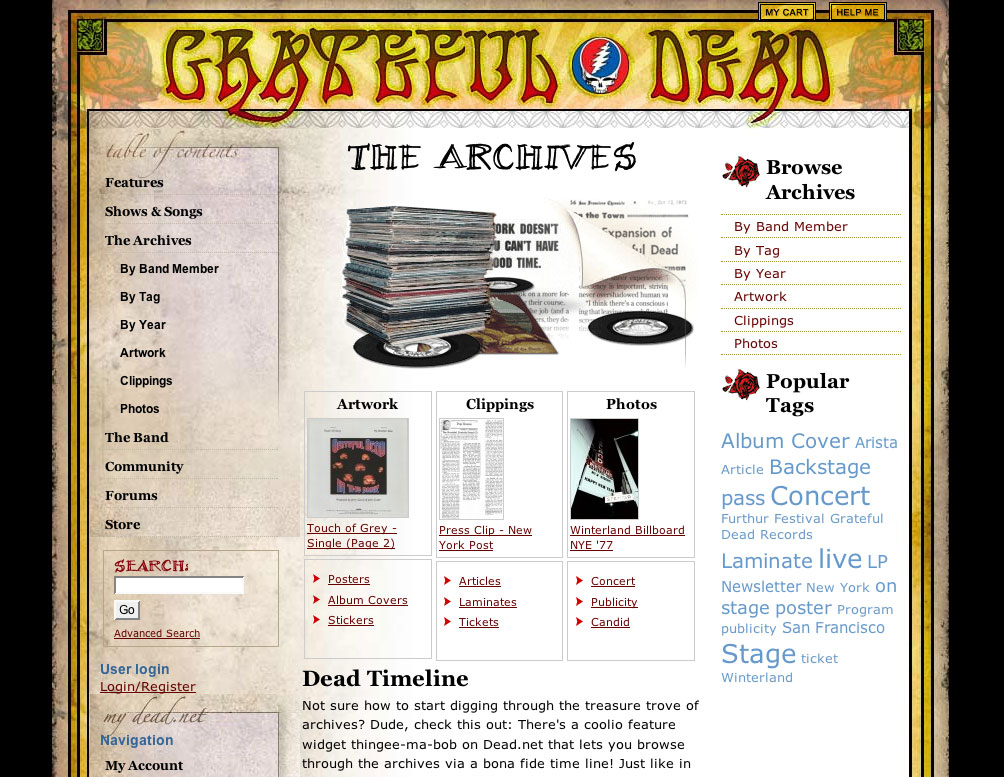 The new version of Dead.net was created on the Drupal content management platform and features extensive archives cataloging Grateful Dead history, songs, photos, memorabilia, and shows, indexed and searchable by tags. Dead users will be able to participate in forums, upload their own photos, and bookmark concerts and shows they have attended. Fans will also be treated to exclusive free mp3 show downloads.