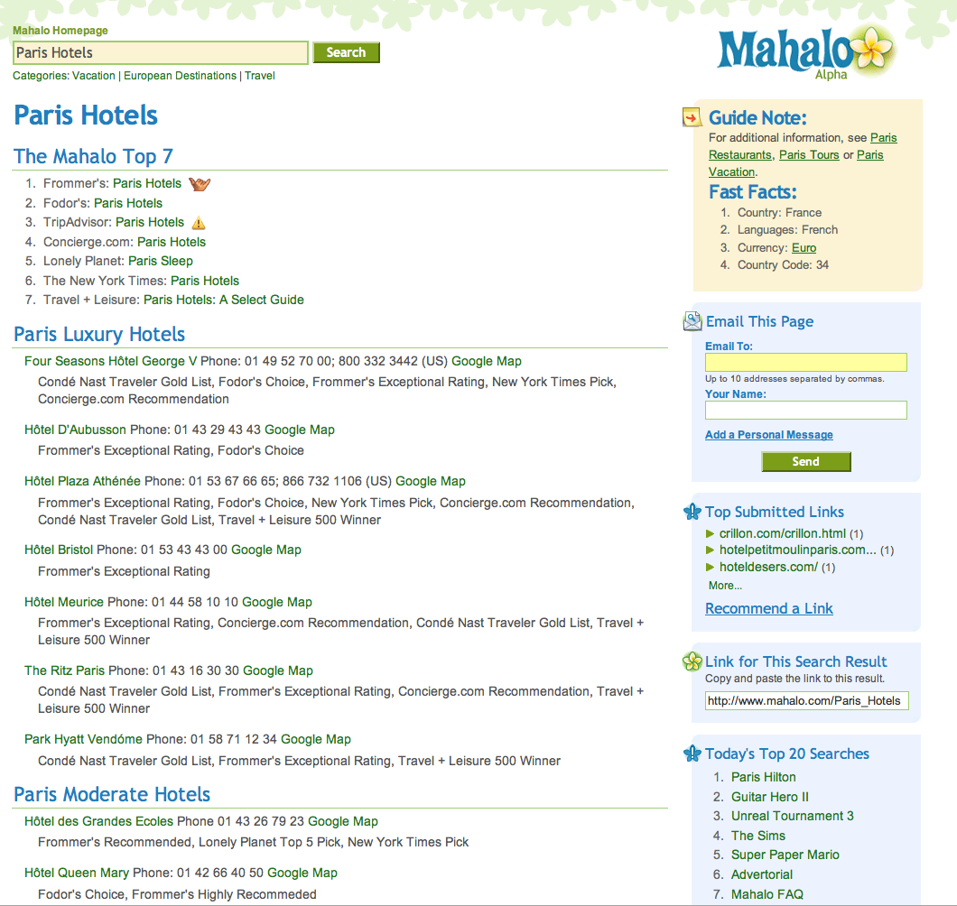 The primary results for search terms are included at the top, in a “top seven” area. These are hand picked results from the guids that should all be good results for the query (see screen shot below of results for “Paris Hotels” – click for larger view). To the right of the results are “Guide Notes” which include additional information including relevant additional searches and “Fast Facts.” In the case of Paris Hotels, the “Fast Facts” include the country, language, currenty and telephone country code.