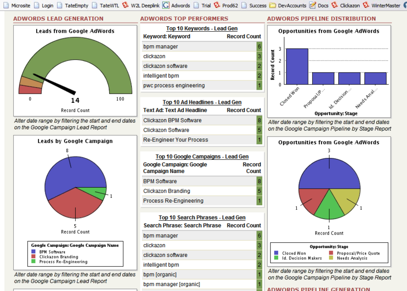 Site owners can also drop “web lead forms” onto the site, which can collect any other customer information (names, email, phone numbers) and bundle it into customer profile. All of this data is enumerated on a dashboard view, which you data on lead generation, sales, and growth. As with any other Salesforce application, users will also be able to mash up the data with other AppExchange Apps. The application will cost $600 for 5 user accounts and come with $50 of Adwords credits.