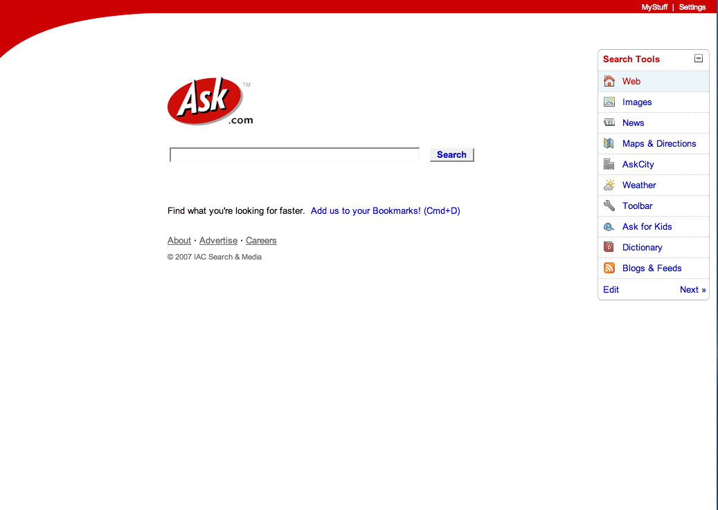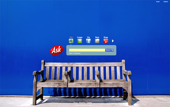 At the core of the changes is a move towards simplicity, though, which may count for more than the other changes. There is a significantly less cluttered home page with lots of white space. Users can skin that page with a number of options by clicking on “skins” below the search box (my favorite is “azul” if you have a wide enough screen – this is the image at the top of this post). Ask says that users will also be able to upload their own images within a month or so. Google recently started offering users the ability to personalize the home page as well.