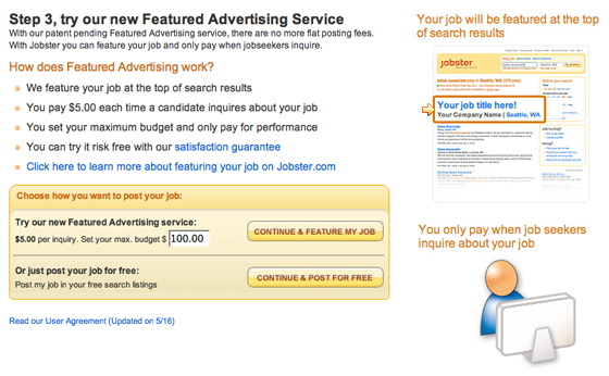 During a beta period, Jobster is charging $5 per applicant. Later they’ll allow companies to set qualifications, so they will only pay for, say, the application of someone who lives in San Francisco with Ruby on Rails development skills. At that time, they will also be moving to an auction model and let companies compete for those top places on search results pages.