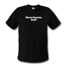 Because Jobs’ keynote stunk to high heaven yesterday, this dude is going to cash in. A simple black t-shirt with the incredibly apt phrase “Worst. Keynote. Ever!” scrawled across the front. Just under $20 will land you a convenient, if not entirely played out, method of registering your disgust with WWDC 2007.