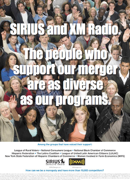 XM and Sirius are trying to merge (or hadn’t you heard?) but have encountered a lot of resistance in both the government and the press, to say nothing of legions of angry, everyday consumers who are also opposed to it. So the companies bought an advertisement to show just how “diverse” their support is. To see it…