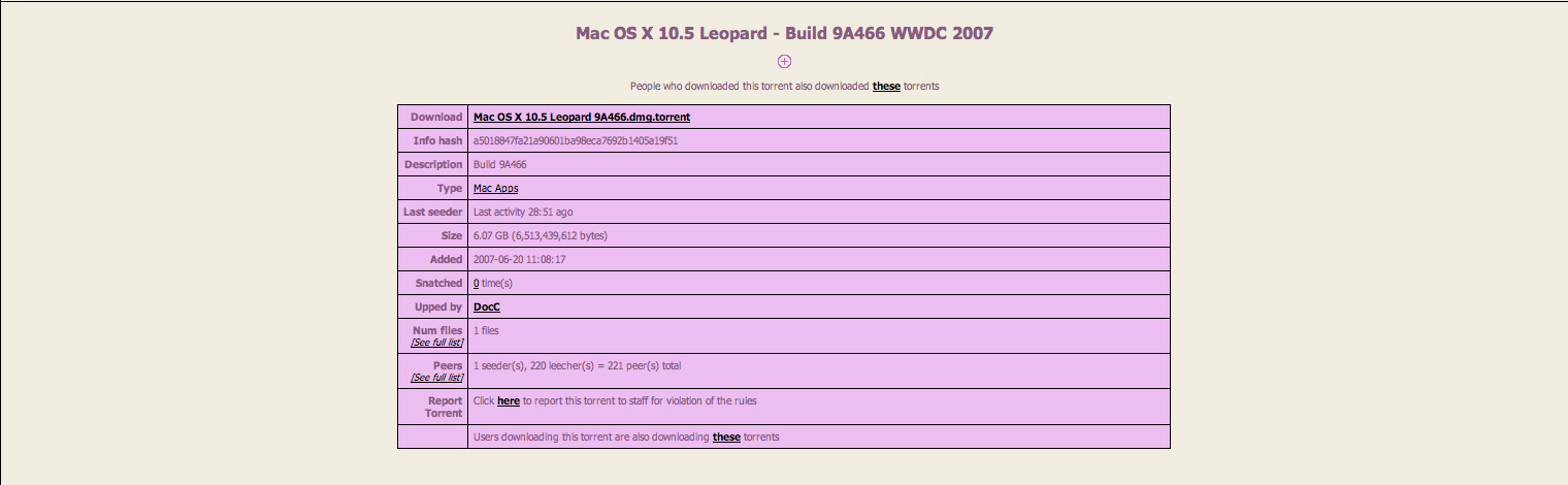 Nobody’s completely downloaded the 6GB file yet, but the site’s forum is red hot with activity and the file already has 205 comments. Choice lines about the leak in recent days have included “this is f*#$ing ridiculous. i want leopard, and i want it now. hurry, before some heads start to roll” and “Please do not talk about this torrent file outside of OINK.”