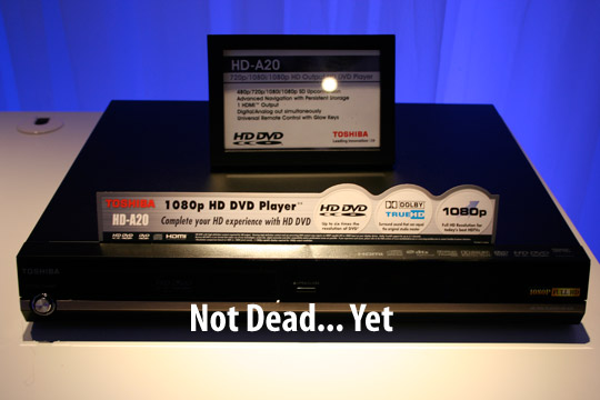 HD DVD ain’t dead yet, no matter what Peter and his interviewees say. Toshiba had a press dealie Thursday that essentially pimped its HD DVD players and Regza HDTVs. (To be honest, I don’t give a damn who wins the high-def optical disc wars, so I’ll happily play each camp against each other until Hell freezes over.) I will say that the ability to upgrade its players’ firmware was a clever maneuver by Toshiba and the upcoming HD DVD release of 300 should inject some much-needed life into HD DVD sales. We weren’t allowed to take pictures during its presentation, but expect features like on-screen picture-in-picture, with the PIP version showing battle scenes before the many blue screen magic tricks were applied.