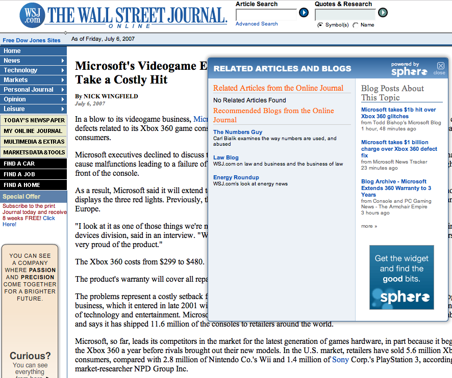 These news sites and 20,000 blogs all have Sphere results included on story pages – see this story on CNN for an example, or the screen shot above for the WSJ implementation. That’s well over 1 billion page views per month with Sphere links and results.