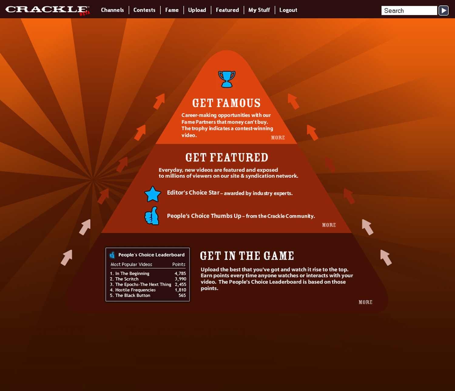 Crackle will allow users to climb the “fame pyramid” as pictured on the right. Anyone will be able to submit a video to the channels, which will be put into a general video library. Viewers will vote for the best videos and during contest periods for special deals, the two top user selected videos will join the editors picks to be chosen for production deals.